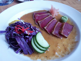*Seared ahi SaShimi: seared rare, lightly blackened served with soy vinaigrette, wasabi & pickled ginger 13.25 (因為是HH (Happy Hour), 所以是半價.)