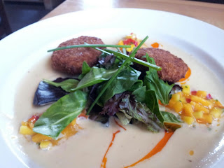 Blue Crab Cake: with mango papaya chutney, passion fruit beurre blanc & tomato oil 11.35 (因為是HH (Happy Hour), 所以是半價.) Blue Cheese 的味道太重了, 所以我不是太喜歡.