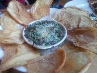 Spinach Cheese Dip : baked with feta, jack, parmesan & cream cheese served with crispy flatbread 10.95 这款的饼很好吃, 有点像炸过的硬面包. (因為是HH (Happy Hour), 所以是半價.)