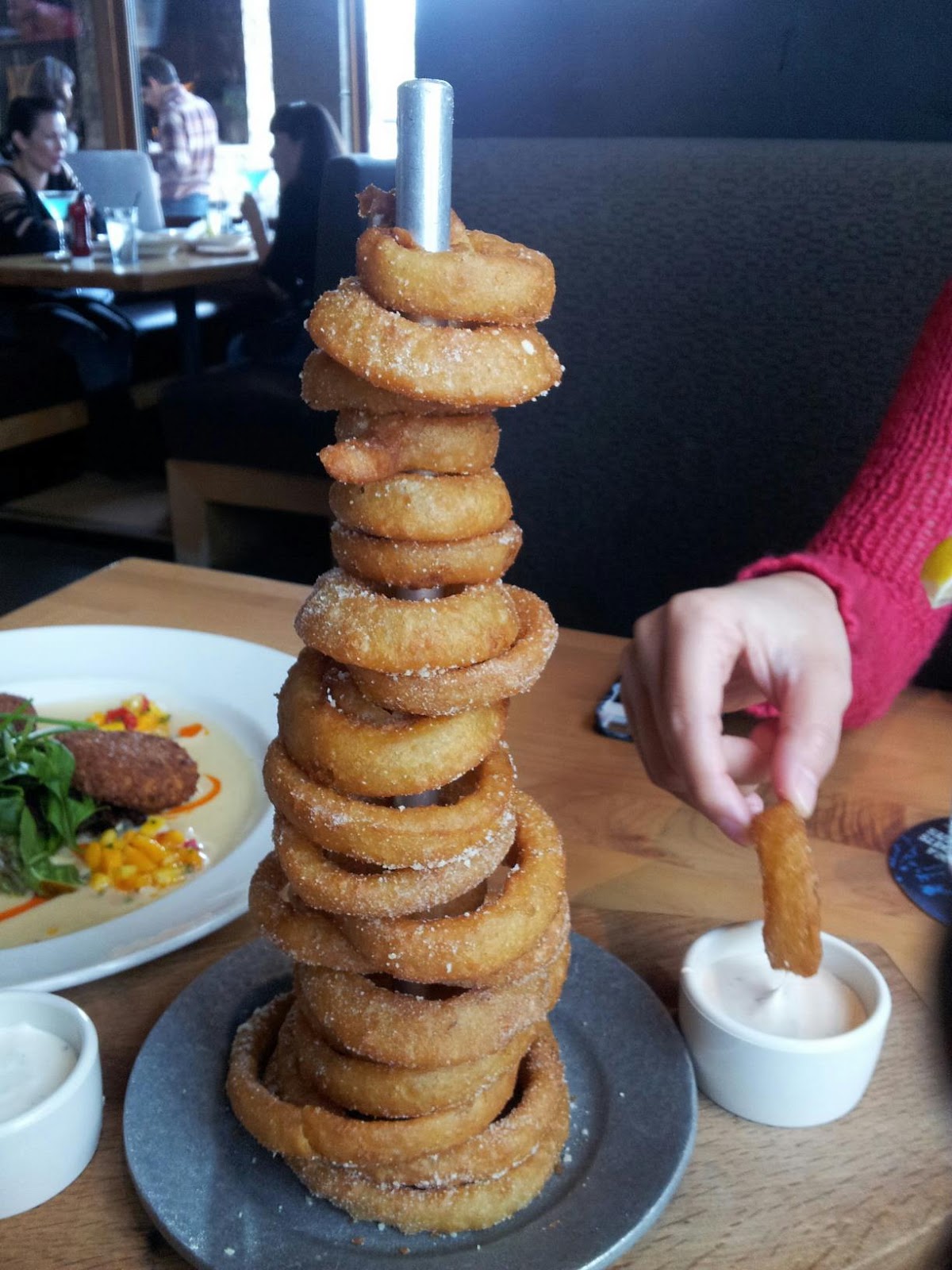 Onion Ring Tower: beer battered, dusted with parmesan, with chipotle & buttermilk ranch dipping sauces 8.75 (因為是HH (Happy Hour), 所以是半價.) 還蠻高的, 出來的時候真的有TOWER 的感覺. 好吃!